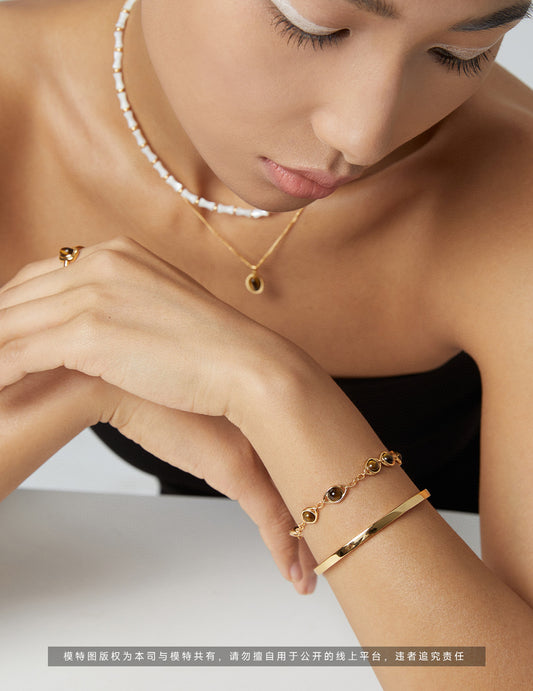 纯银虎眼石/灰贝珠项链 松果形项链,简约而不简单。独特的松果形状设计,仿佛大自然的鬼斧神工,展现出一种自然、清新的美感。金色的链条环绕颈间,宛如一条优雅的河流,轻轻诉说着时尚与经典的交融。