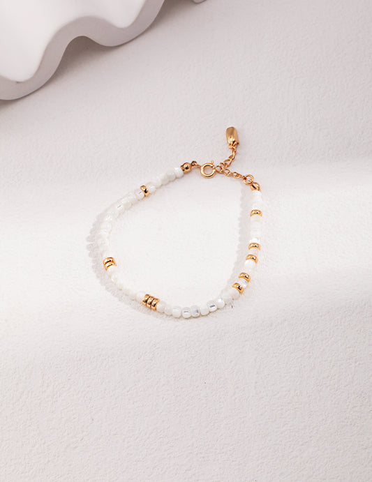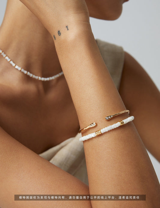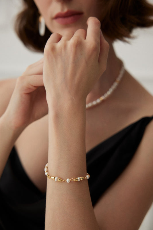 The golden lines of the pearl bracelet are as elegant as flowing water, and each pearl shines with unique brilliance. Wearing it on your wrist, it feels like a star has fallen into the mortal world, adding a touch of mysterious charm to you.