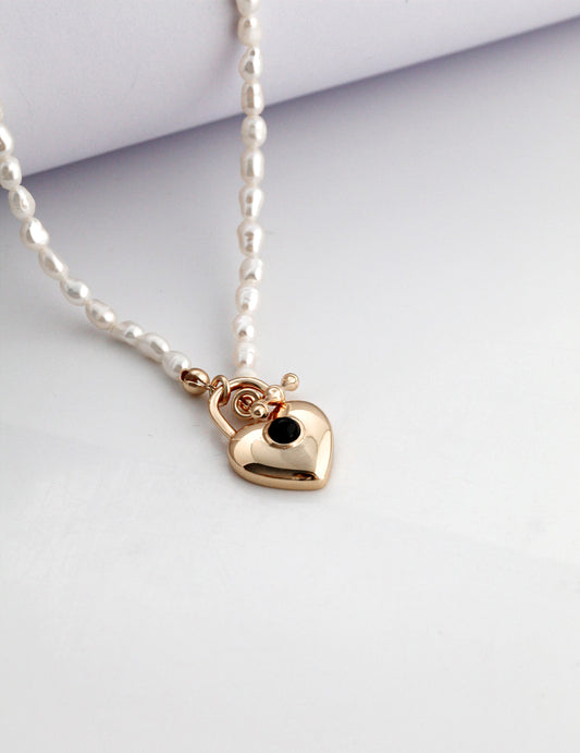 Sterling silver heart-shaped rice-grain pearl necklace (certificate not included)
