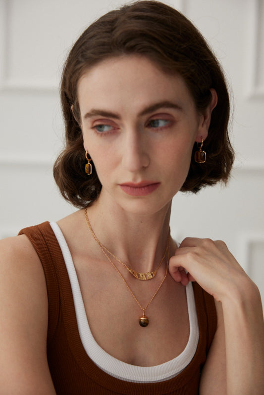 纯银虎眼石/灰贝珠项链 松果形项链,简约而不简单。独特的松果形状设计,仿佛大自然的鬼斧神工,展现出一种自然、清新的美感。金色的链条环绕颈间,宛如一条优雅的河流,轻轻诉说着时尚与经典的交融。