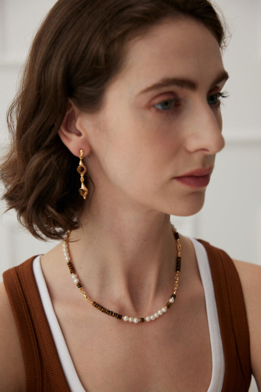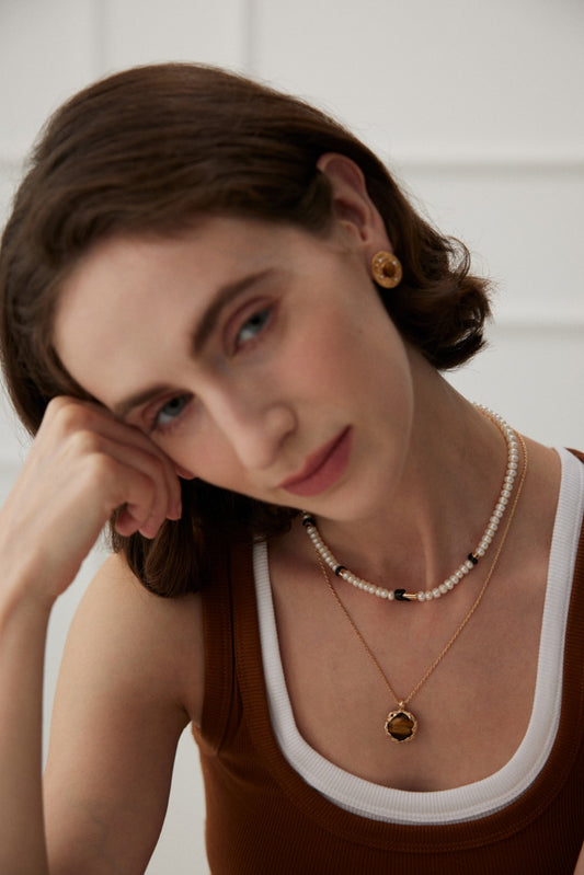 珍珠虎眼石复古项链,宛如一位优雅的古典美人,在时光的长河中款款走来。银白色的珍珠串成优雅的项链,每一颗都散发着温润的光泽,仿佛蕴含着深海的秘密。
