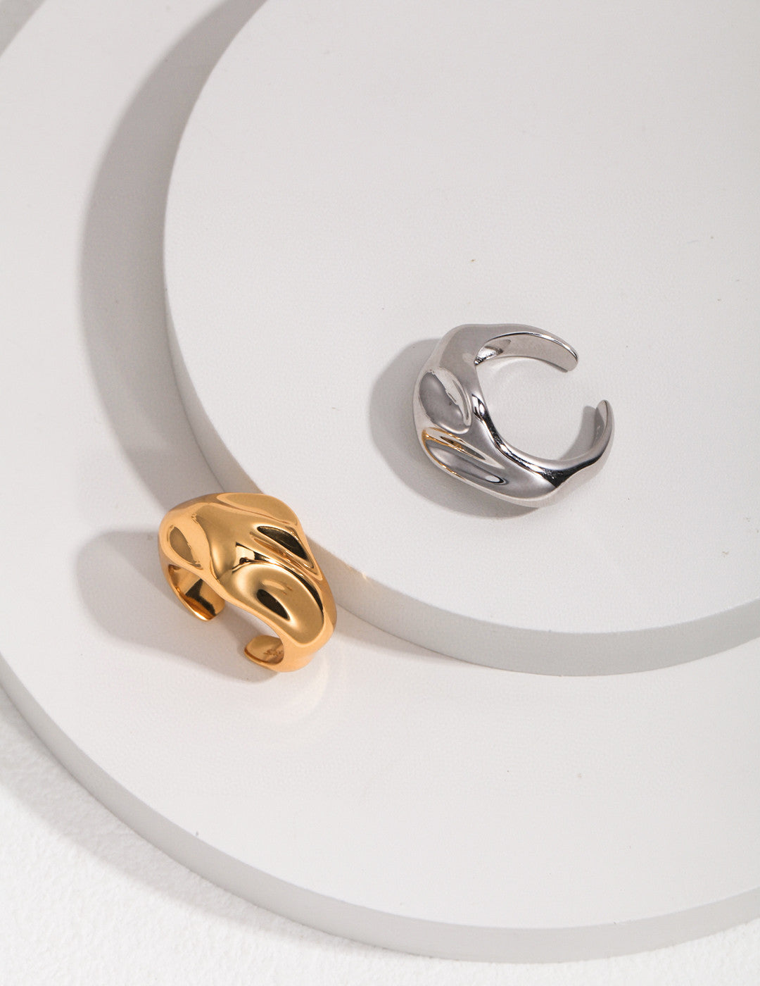 The irregular surface design, shiny satin texture and irregular shape can show the flow of silver light and shadow with great visual impact, and the open style structure is more suitable for wearing in different occasions.