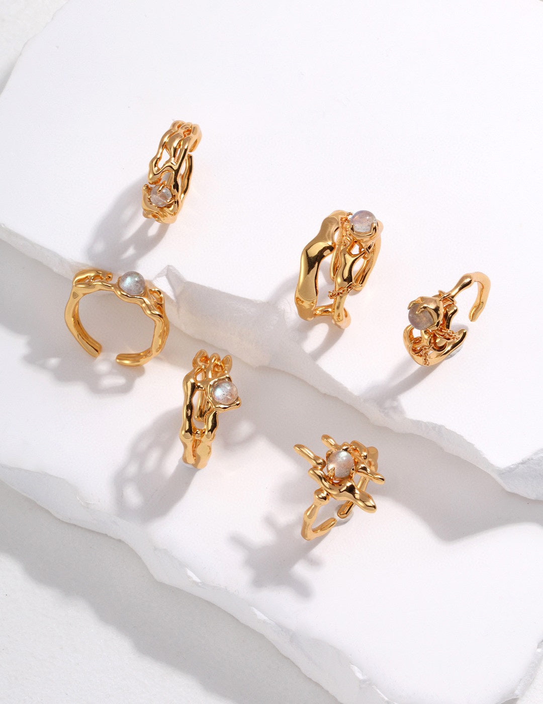 The fluid design has a natural liquid texture surface, irregular surface bumps, rhythmic ups and downs, and is inlaid with gray moonstones, which are integrated into the design.